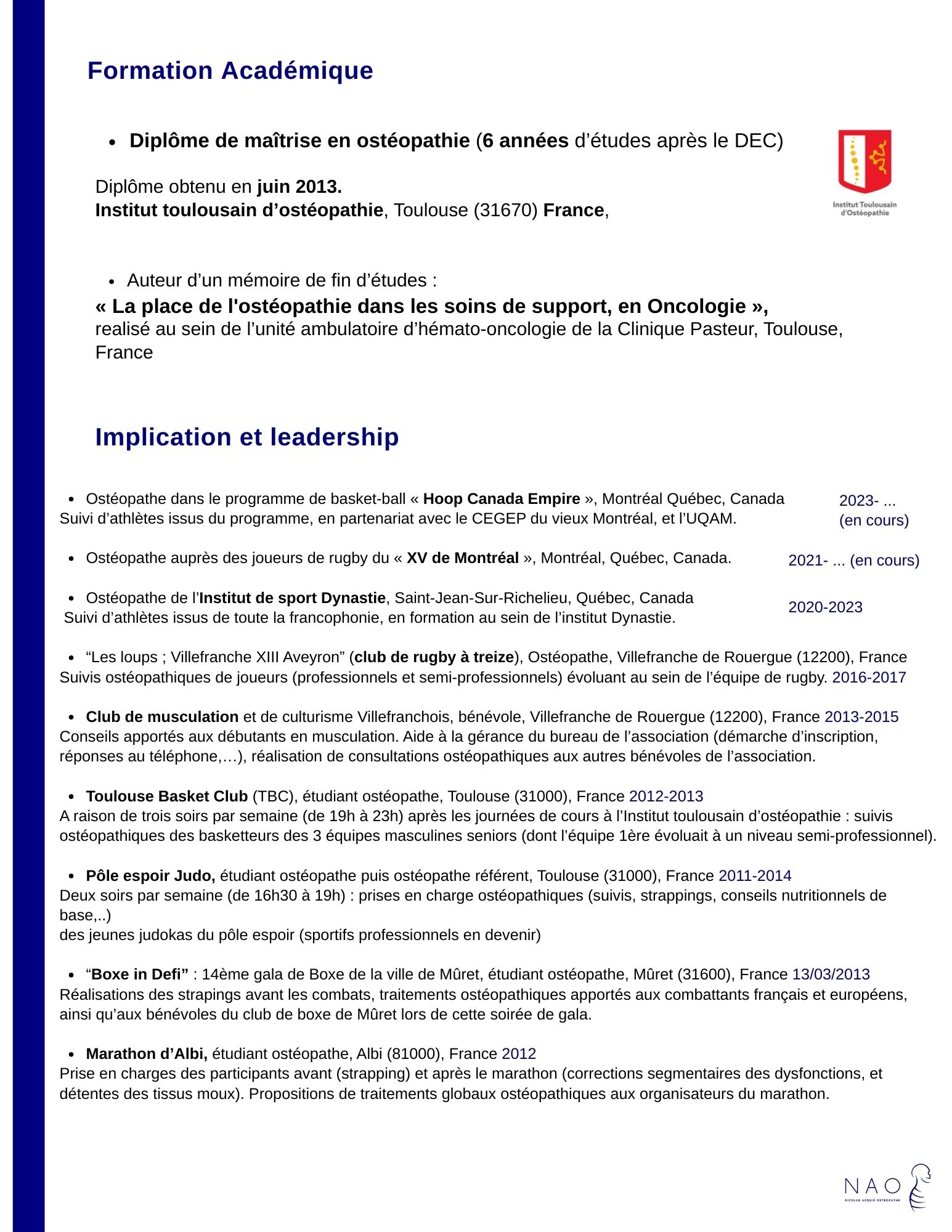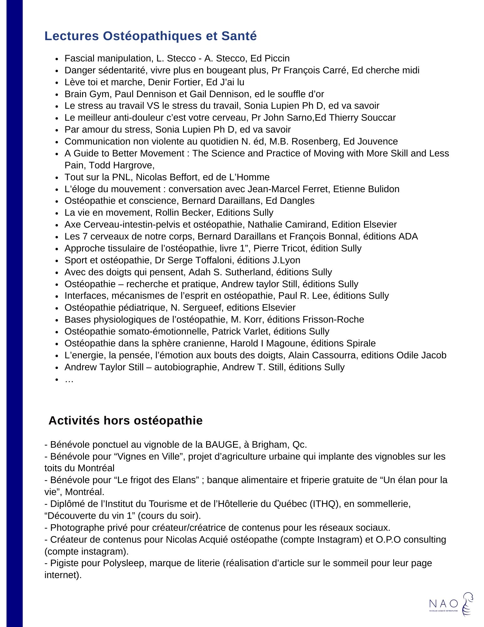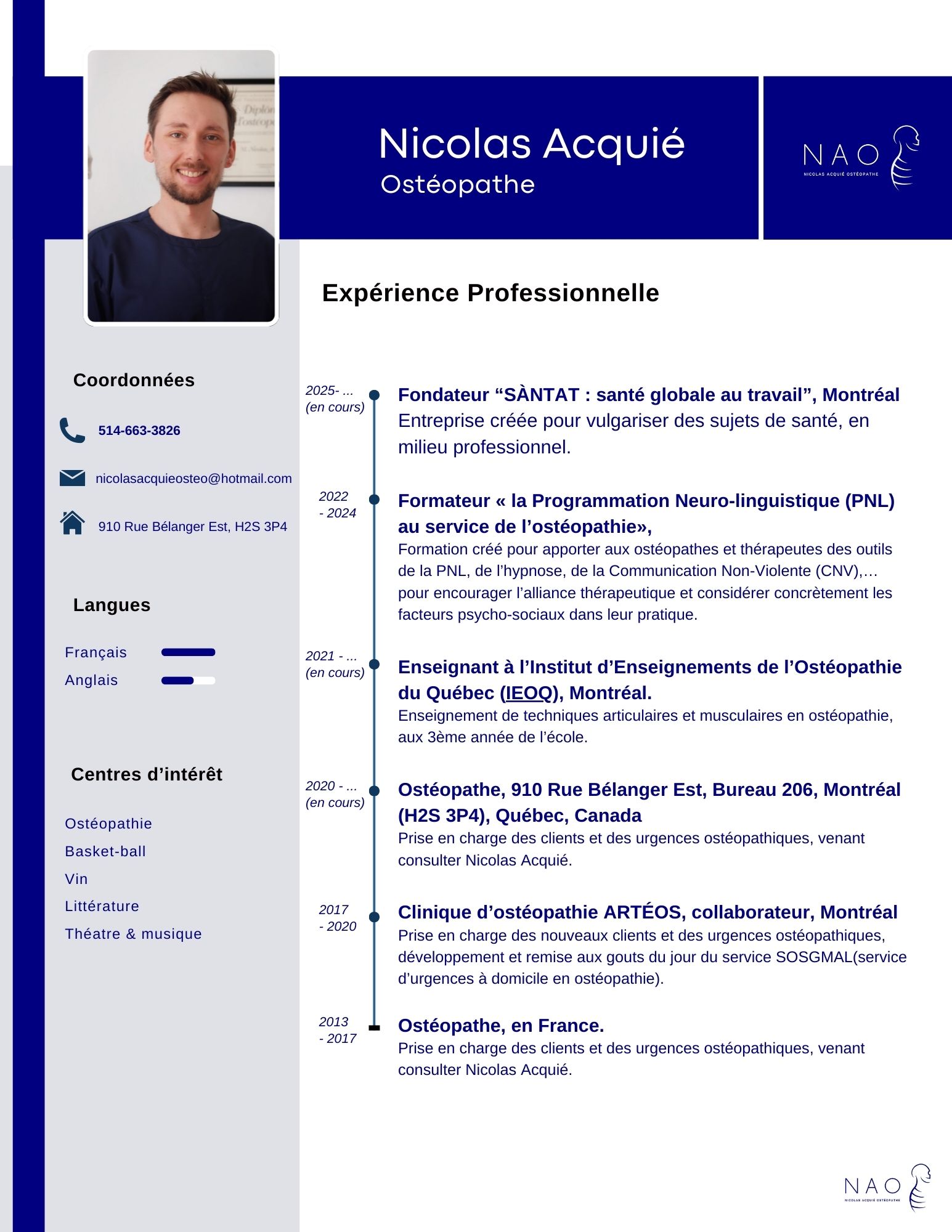 Ce Curriculum vitae (CV) présente le parcours professionnel et les formations continues de Nicolas Acquié, ostéopathe à Montréal. Il retrace son expérience en cabinet, son implication dans l’enseignement de l’ostéopathie, ainsi que les formations suivies au fil des années afin de faire évoluer sa pratique.