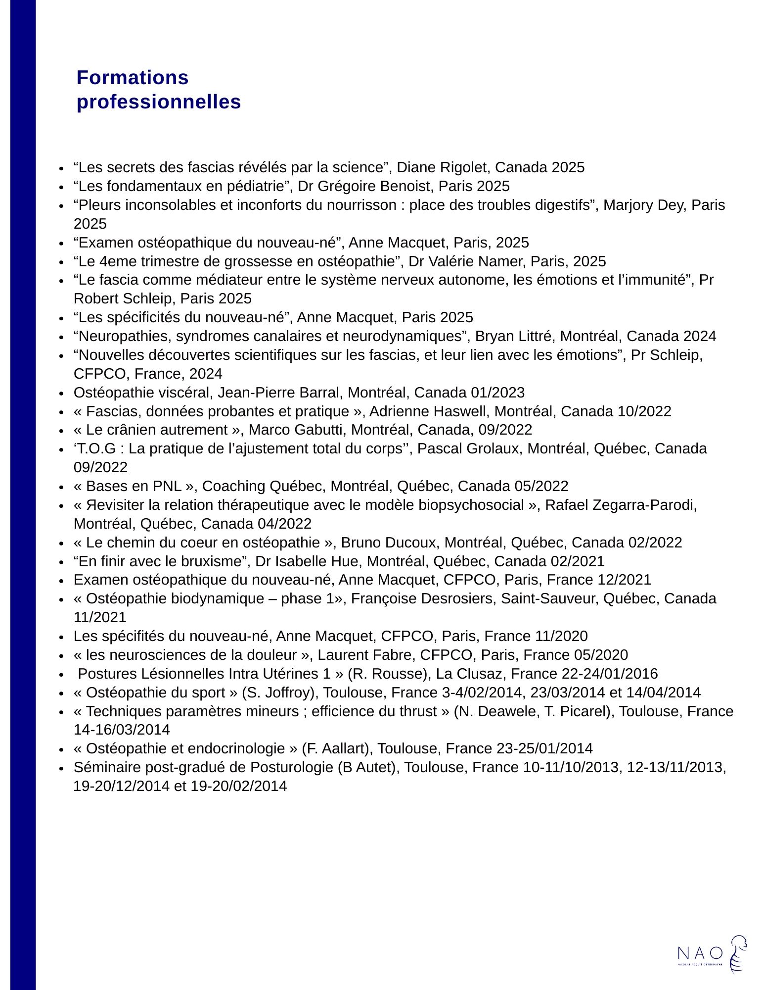 Grâce à ce CV, vous pouvez découvrir cette démarche de formation continue qui reflète une volonté d’approfondir la compréhension du corps et d’adapter son approche aux différentes situations rencontrées en consultation.